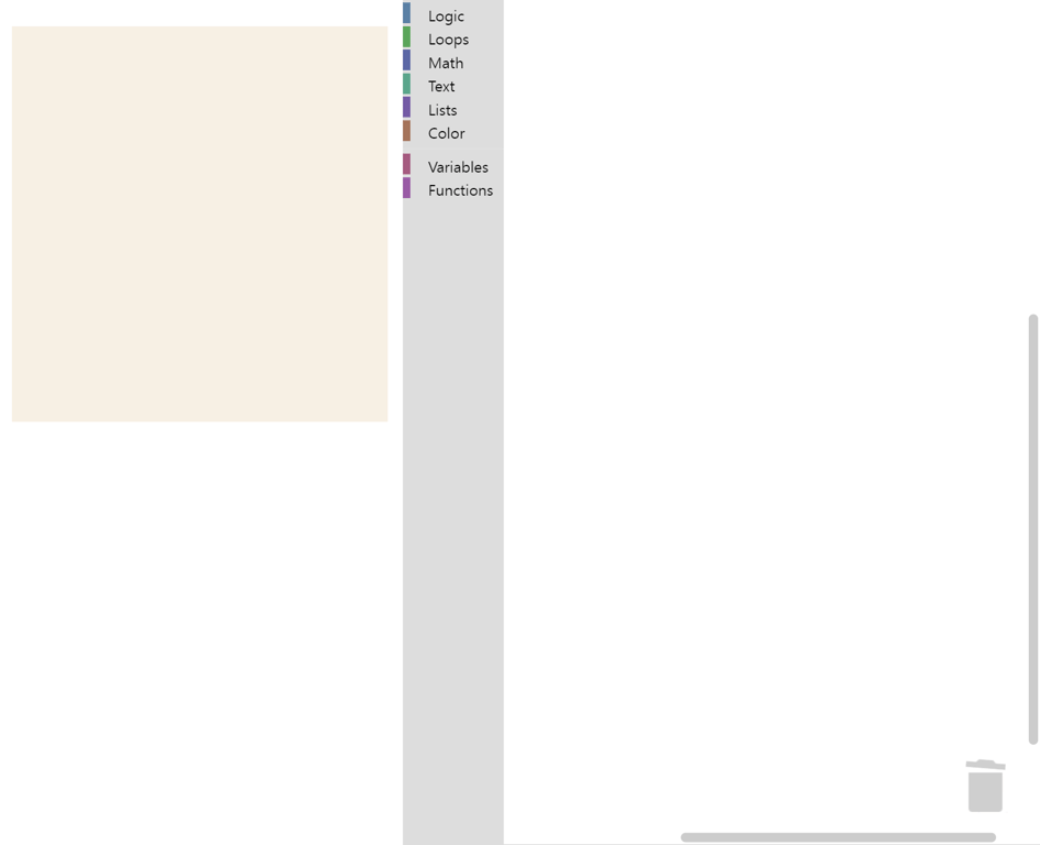 화면 오른쪽에 보이는 공간이 Blockly 의 핵심인 코드 편집기이며 워크스페이스(workspace) 라고 부릅니다. 우리가 만든 콘텐츠에 블록코딩을 적용할 때에도 위 편집기를 그대로 활용하실 수 있습니다.