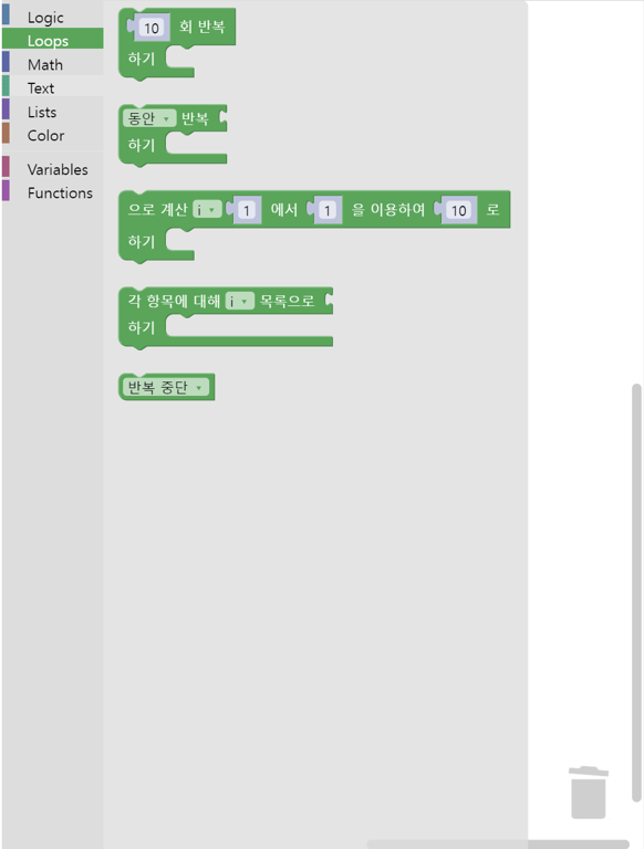 Blockly의 핵심인 코드 편집기의 화면 구성은 모두 살펴보았습니다.