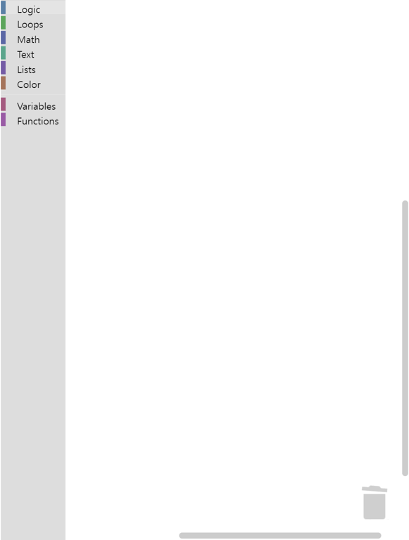 워크스페이스의 왼쪽에 보이는 리스트들을 클릭하면 해당 항목에 맞는 다양한 블록들을 보실 수 있습니다. 이 리스트와 블록 부분은 툴박스(toolbox) 라고 부릅니다. Logic, Loops, Math 와 같은 항목들은 공통된 속성을 가지는 블록들을 모아 놓는 카테고리 역할을 합니다. 카테고리에서 블록을 선택 후 드래그해서 오른쪽 편집 영역으로 끌어다 놓으면 블록들을 추가하거나 배치할 수 있습니다.